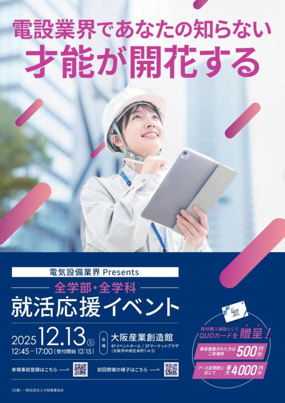12月13日(土)に開催の一般社団法人 大阪電業協会主催 「電気設備業界Presents 就活応援イベント」